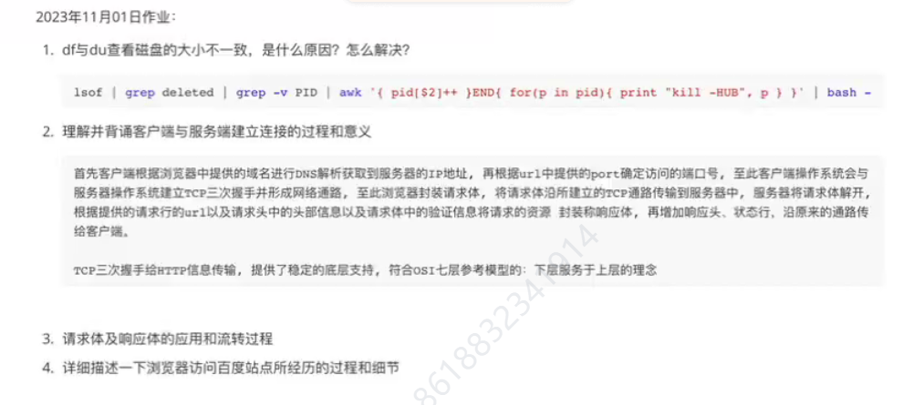 ^(?=.*?[A-Z])(?=.*?[a-z])(?=.*?[0-9])(?=.*?_).{8,10}$------------------------------------------------------------------------------#2023年11月1日16:36:40------------------------------------------------------------------------------#1. df与du查看磁盘的大小不一致,是什么原因?怎么解决?用户删除了仍在使用的文件,文件删除了但是文件句柄仍然保留,df命令统计文件句柄,du命令不会在文件系统目录中统计这些文件。解决方法:使用lsof | grep deleted 命令查找到带有deleted标识符的进程PID,然后kill -1 PID 重启它,就恢复正常命令:lsof | grep deleted | grep -v PID | awk '{ pid[$2]++ }END{ for(p in pid){ print "kill -1",p}}' | bash -------------------------------------------------------------------------------#2. 理解并背诵客户端与服务端建立连接的过程和意义首先客户端根据浏览器中提供的域名进行DNS解析获取到服务器的IP地址,再根据url中提供的port确定访问的端口号,至此客户端操作系统会与服务器操作系统建立TCP三次握手并形成网络通路,至此浏览器封装请求体,将请求体所建立的TCP通路传输到服务器中,服务器将请求体解开,根据提供的请求行的url以及请求头中的头部信息以及请求体中的验证信息将请求的资源封装成响应体,再增加响应头、状态行、沿原来的通路传给客户端。意义:TCP三次握手给HTTP信息传输,提供了稳定的底层支持,符合OSI七层参考模型的:下层服务于上层的理念。------------------------------------------------------------------------------#3. 请求体及响应体的应用和流转过程初始化请求体包含请求行(包含了Method、URL、Version)、请求头(包含了由服务器确定的请求头)、请求体(包含了用户信息、令牌等)初始化响应体包含响应行(包含了http状态码、Version)、响应头(返回请求头对应的响应头)、响应体(包含了html、css、JavaScript、媒体文件等)1、用户在浏览器输入url2、浏览器根据输入的url地址确定服务器的IP地址3、浏览器开始构建请求体4、利用http三次握手将请求体传输到服务器5、服务器接收并识别请求体中的用户信息并进行身份甄别6、根据URI判断是否包含对应的资源7、如果不包含:返回带有错误状态码的响应体。如果包含:封装好对应的初始响应体并按照接收路径向浏览器返回响应。------------------------------------------------------------------------------#4. 详细描述一下浏览器访问百度站点所经历的过程和细节1、打开浏览器输入www.baidu.com后按回车2、浏览器根据输入的url地址确定服务器的IP地址(使用了DNS协议)3、浏览器开始构建请求体(请求行:Method URL Version、请求头:由服务器确定、请求体:包含了用户信息,令牌等信息)4、电脑通过三次握手将请求体传输到服务器5、服务器接收并识别请求体中的用户信息进行身份甄别6、根据URI判断是否包含对应的资源7、如果不包含:返回带有错误状态码的响应体。如果包含:封装好对应的初始响应体并按照接收路径向浏览器返回响应。8、用户看到网页界面------------------------------------------------------------------------------